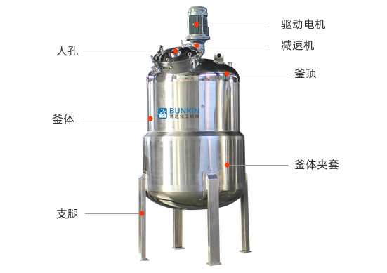 3、不銹鋼攪拌罐蓋上部配置有傳動裝置(電機(jī)或減速器),由傳動軸驅(qū)動攪拌罐內(nèi)的攪拌器。
